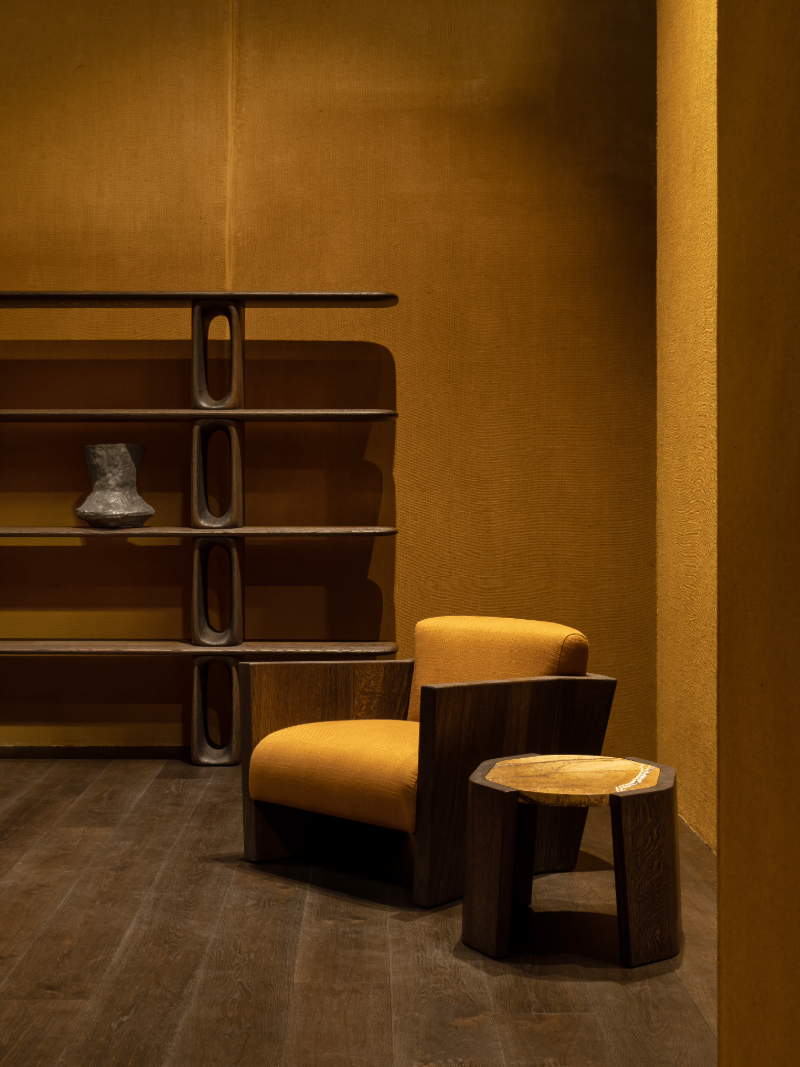 De FORT Lounge Chair van Sebastian Herkner combineert ultiem comfort met een robuust ontwerp. De brede, gewatteerde zitting en rugleuning bieden optimale ondersteuning, terwijl het houten onderstel met gebogen elementen doet denken aan een versterkte structuur.